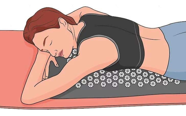 - Allongez-vous sur le ventre après une séance d’entraînement intense. Descendez lentement, le ventre en avant, sur le tapis d’acupression. Drapez et rentrez vos bras sous votre tête et votre cou, afin d’être aussi confortable que possible. Essayez de centrer votre poitrine et votre abdomen sur les pointes pendant que vous faites cela.