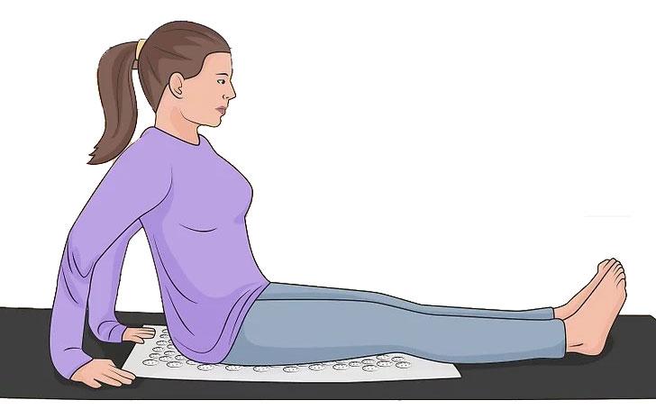 - Améliorez votre posture en vous asseyant bien droit sur le tapis. Gardez vos jambes et votre dos droits, en centrant vos fesses sur les pointes en plastique. Arquez vos bras vers l’arrière et placez-les sur le tapis de yoga si vous souhaitez vous donner un soutien supplémentaire.