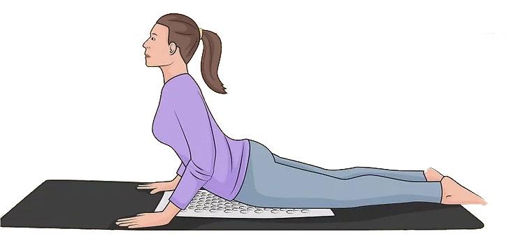 - Reposez-vous sur le tapis dans la position du cobra pour soulager vos quadriceps. Allongez-vous face contre terre sur votre tapis d’acupression, puis soulevez le haut de votre corps avec vos bras pour créer la position du cobra. Concentrez-vous pour créer une courbe douce avec votre dos, en centrant vos cuisses et votre aine sur le tapis.